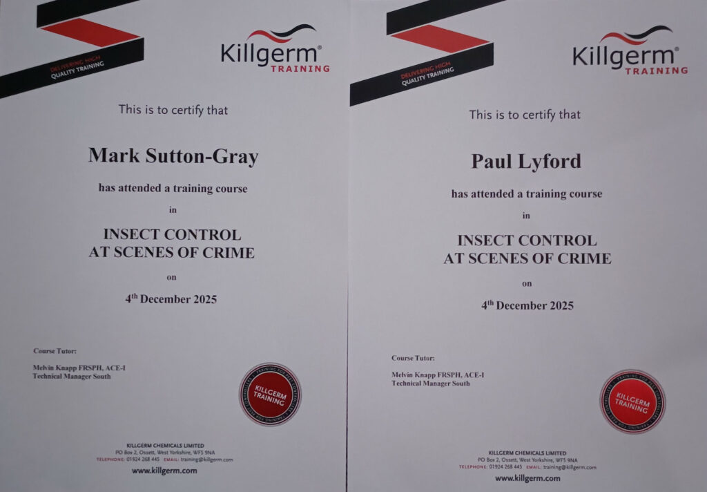 The course demonstrates specialist knowledge in controlling insect activity at crime scenes and other high-risk locations, with a strong emphasis on safety, compliance, and industry best practice. It reflects advanced understanding of contamination risks, controlled treatment methods, and the importance of discretion and professionalism when working in complex and sensitive settings.