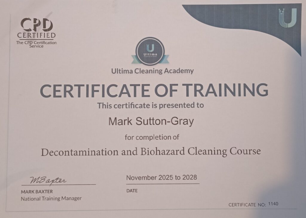 The course is CPD certified and valid from November 2025 to 2028, reflecting ongoing professional competence and adherence to recognised industry standards. It evidences specialist knowledge, compliance with best practice, and a commitment to maintaining high levels of safety, professionalism, and care within sensitive cleaning environments.